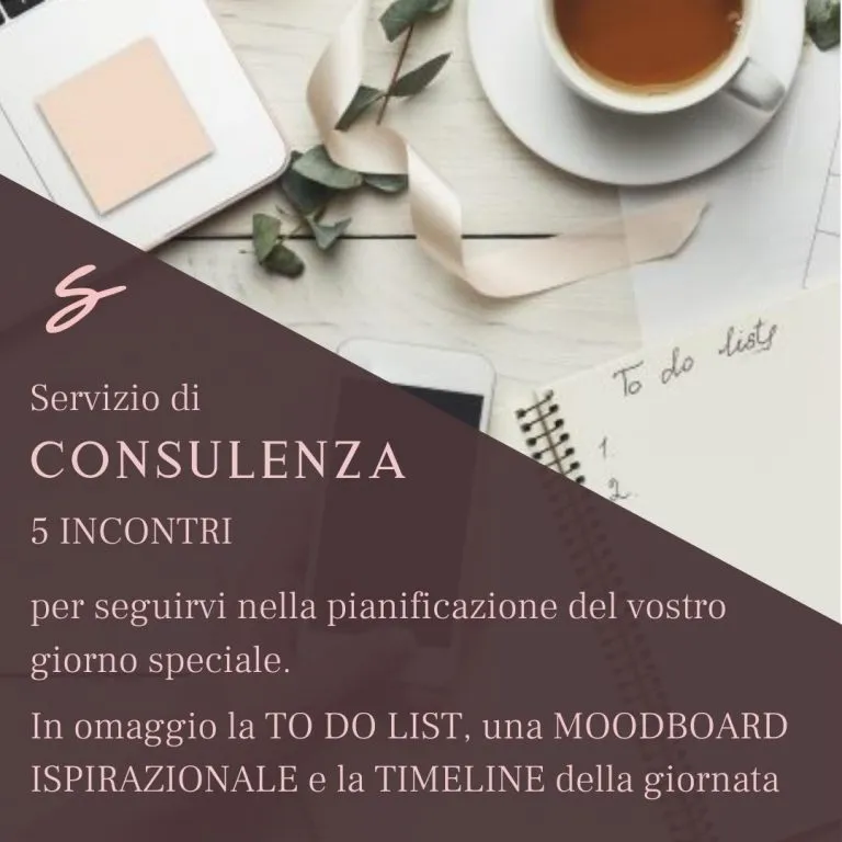Vi forniremo i nominativi dei diversi fornitori che abbiamo selezionato in anni di esperienza. Vi offriremo consigli e suggerimenti su come organizzare nei dettagli il vostro giorno, su come creare la moodboard, su come gestire il budget e come coordinare i fornitori. Vi aiuteremo a pianificare la logistica e la gestione degli orari della giornata. Vi daremo suggerimenti come rendere unico il vostro matrimonio.